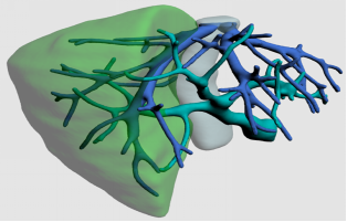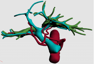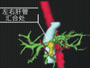 脉管评估:计算机辅助手术规划系统进行三维重建,精确评估脉管空间走行。红色为肝动脉和腹主动脉,蓝色为门静脉系统,绿色为胆管系统。 |