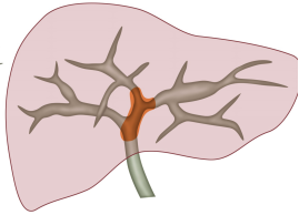 肝脏标本:切除的左三区和尾叶肝脏标本,剖开胆管,可见肿瘤沿胆管壁浸润生长,胆管切缘未见肿瘤浸润。病理回报为肝门胆管细胞癌,粘液腺癌,肿瘤大小约1.8*1.5*1cm。胆管切缘阴性。 |