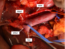 淋巴结清扫:肝门分别游离肝动脉、门静脉,进行骨骼化清扫。确认胆总管下端无肿瘤侵袭后进行离断。 |