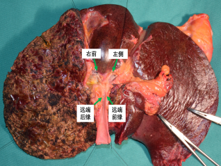 肝脏断面:移出标本后,肝脏断面上可见肝右静脉全程显露,右前和右后胆管两个开口,备胆肠吻合。手术历时707分钟,出血500ml。术后20天患者顺利出院。 |
