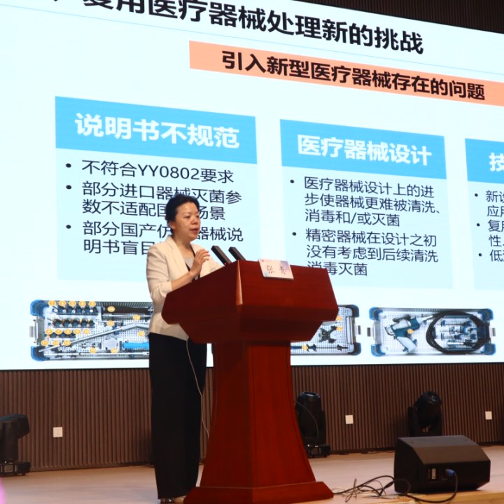 上午首场是由中华护理学会消毒供应中心专业委员会首席专家、北京护理学会消毒供应中心专业委员会主任委员张青主任委员以“新质生产力背景下复用医疗器械的再处理挑战”为题,深入剖析了新质生产力背景下,当前复用器械处理中的难点与对策,强调了新型医疗器械处理流程优化与质量控制在保障手术安全中的重要性。