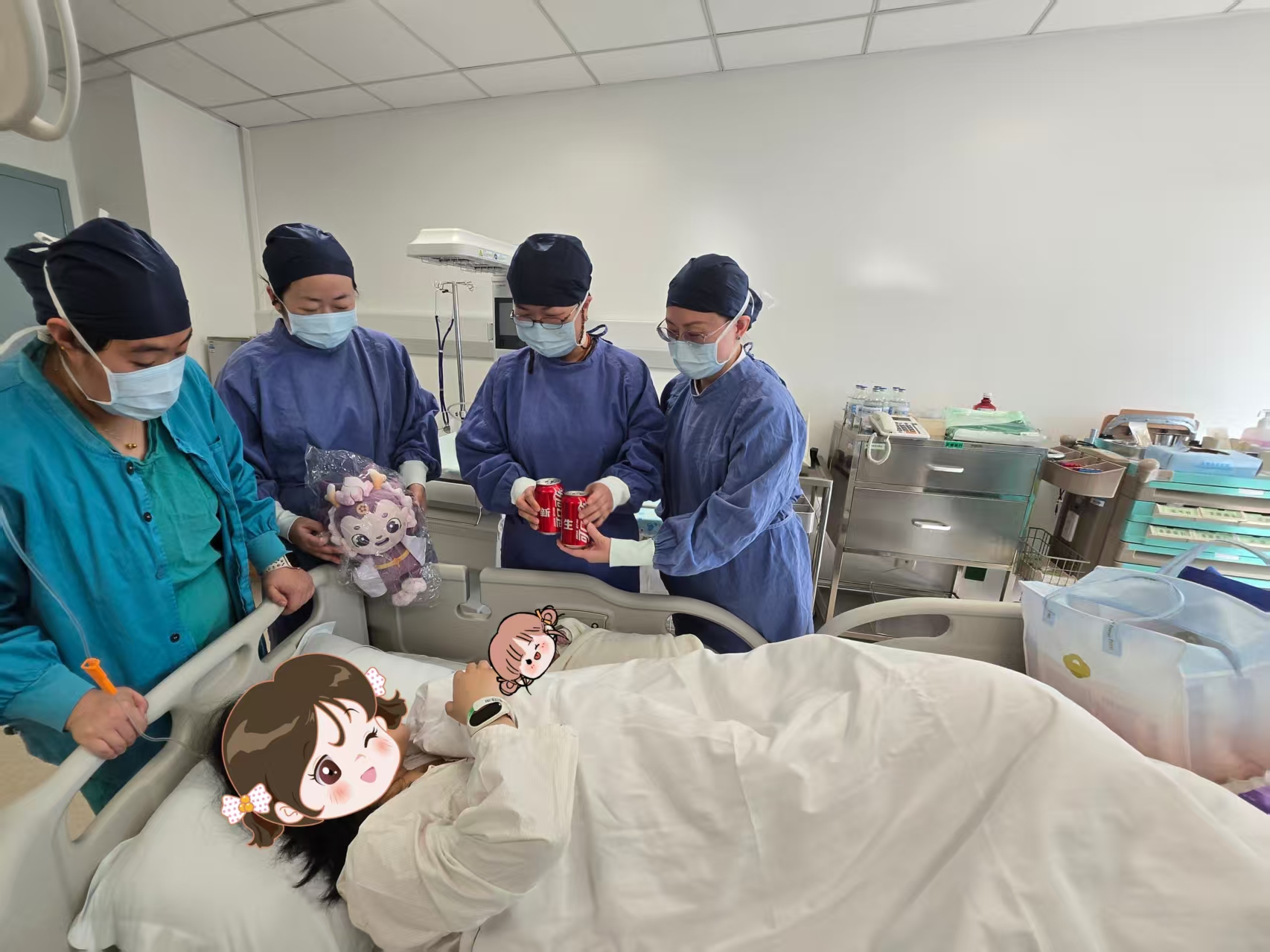 尤为可喜的是,就在搬迁当天中午,伴随着一声清脆响亮的啼哭,新产房迎来了第一个新生命的降临!这位幸运宝宝的顺利降生,不仅为新的环境带来了无尽的喜悦与活力,更以最完美的方式为新产区的启用献上了“开门红”的贺礼。母子平安的圆满结果,是对所有参与搬迁和接产的医护人员辛勤付出的最好回报。妇产中心的张蕾副主任、黄振宇副主任和刘虹培训副督导为产妇及新生儿送上分娩贺礼——我们医院的IP形象玩偶以及印有“新生”字样的可乐。