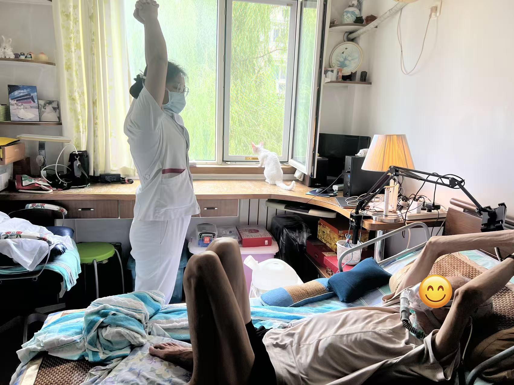 88岁高血压、房颤、脑出血后遗症等多种慢性病的张奶奶(化名),长期卧床并留置胃管、尿管,双下肢肌力仅1级,右手多指坏疽,居家医疗介入后开展生活功能与肌骨康复训练,逐步恢复部分生活自理能力,不再局限于床。