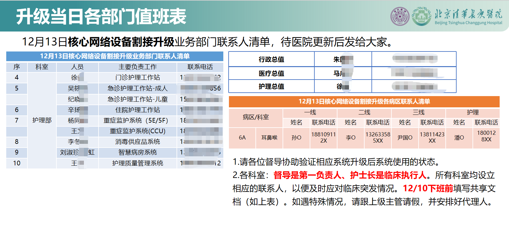 我们知道,网络是全院业务的基石,更是护理工作高效、安全运转的命脉。12月10日护理部即召开护士长动员会,向全体护士长阐明此次任务的重要性、复杂性与协同性。这不是信息中心的“独角戏”,而是需要所有临床科室紧密配合的“团体战”。会上,我们明确了各环节的配合要点与应急职责以及梳理护理相关流程的手工作业,确保思想统一、步调一致。