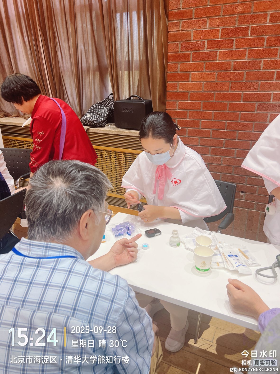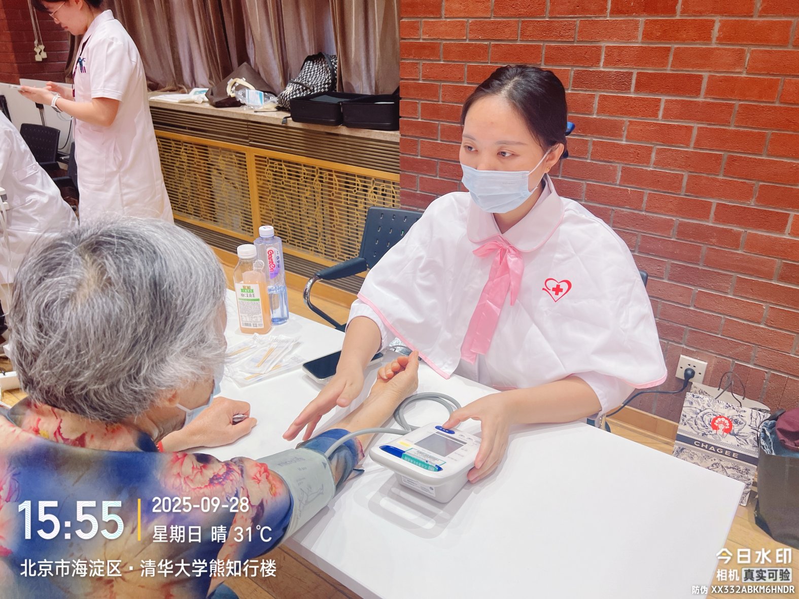 金秋十月的清华园,银杏叶缀满枝头,熊知行楼老年活动中心的多功能厅内,却比院中的秋阳更暖几分。为迎接10.1国际老年人日之际,2025年9月28日下午十四时许,一支身披“南丁格尔志愿者”马甲的护理团队,带着血压计与血糖仪,与这里的退休教职工们,共赴了一场酝酿许久的“健康之约”。