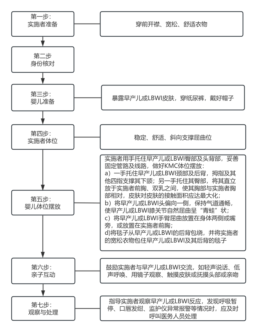应依据早产儿或LBWI、实施者耐受性及早产儿或LBWI在KMC期间的稳定性决定KMC持续时间,并尽可能地延长KMC时间。