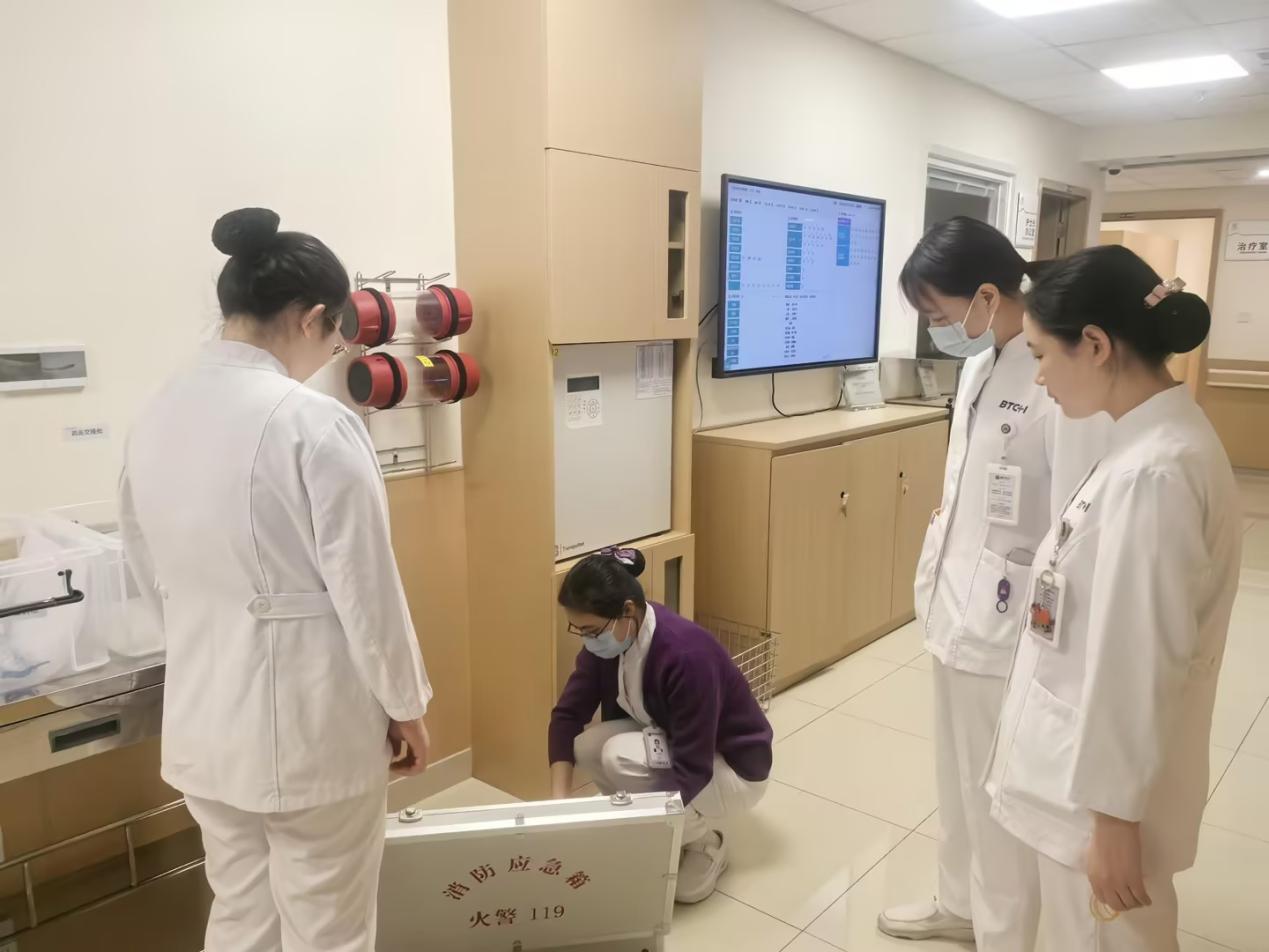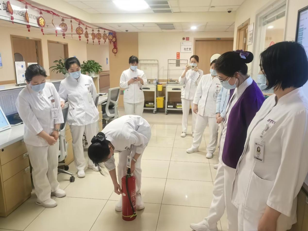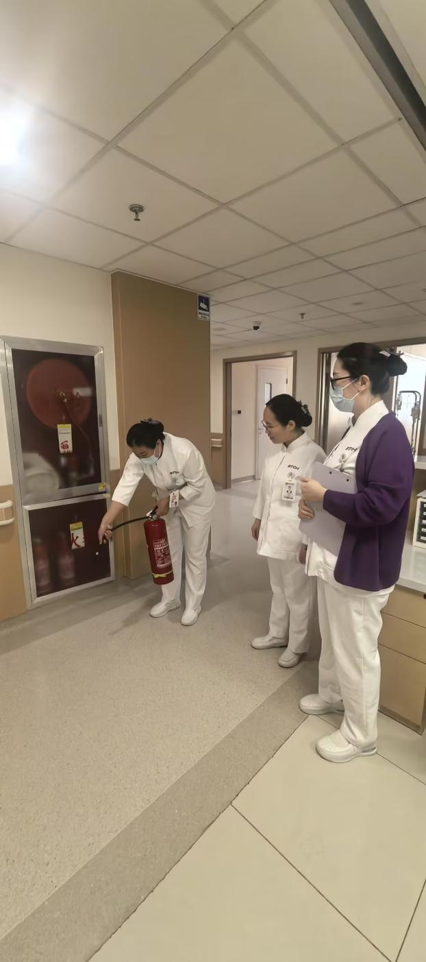 安全卫生管理委员会深入门急诊、病房、手术室等重点区域拉网式排查,紧盯三大核心领域。用电安全方面,严查插排串接、线路老化等问题,现场纠偏并督促建立巡检台账;消防管理上,全覆盖核验灭火器配置、有效期等,抽查操作能力并现场演示,当场整改摆放、标识问题;危化品管控中,检查酒精储存、领用与双人双锁执行情况,强调节日专人专管、日清日结,杜绝超量混存。闫维娜主任反复强调,各科室要以 “时时放心不下” 的责任感落实安全生产措施。