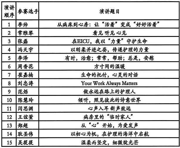 选手从不同角度诠释护理力量:有崔嘉楠关注生命尽头的心灵对话;冯天宇展现男护士刚柔并济的担当;既有李帅“从‘活着’到‘好好活着’的人文关怀”,也有范烁“9年急诊征途的坚守与成长”;新护士既有郑超以“初心”与“匠心”为关键词,分享了入职两月的蜕变又有耿圣伟发挥男护士优势,在平凡中传递抚慰病痛、点亮生命的力量。