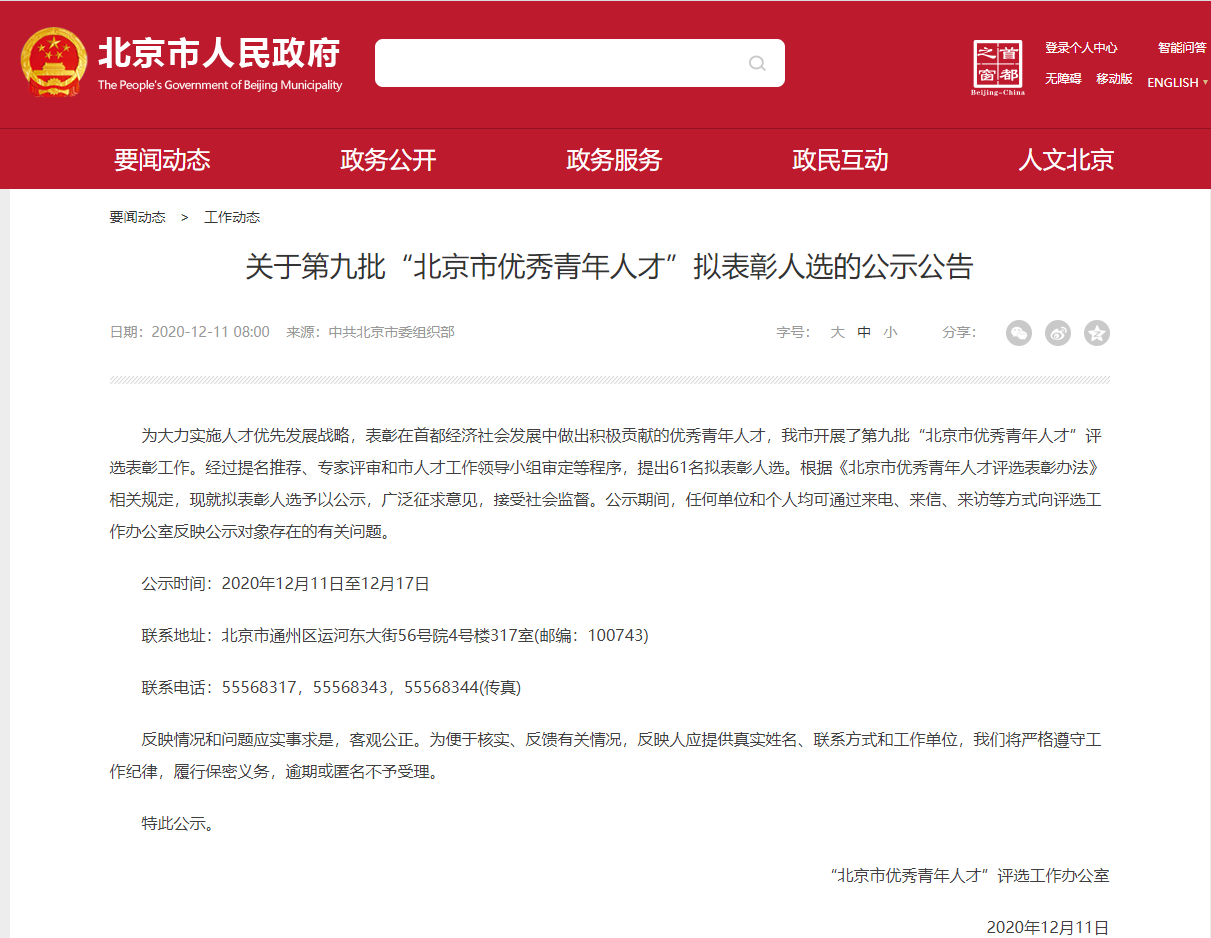 “北京市优秀青年人才”是以市委、市政府名义评选表彰的北京市优秀青年人才项目,每三年评选一次,表彰在首都经济社会发展中做出卓越贡献的各领域、行业优秀青年人才,促进创新型、领军型高层次人才队伍建设,本届评选表彰注重向在新冠肺炎疫情防控工作中贡献突出的优秀人才倾斜。