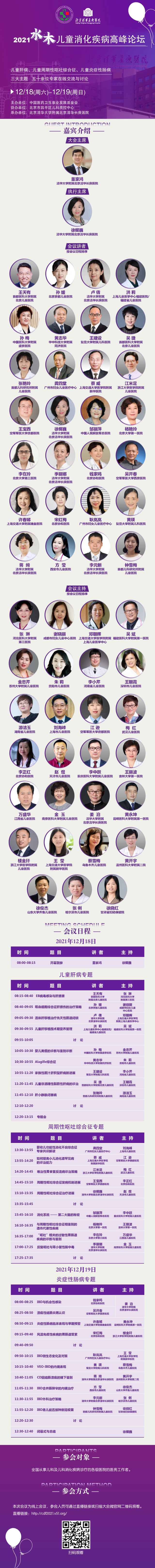 为进一步加强全国儿童消化系统疾病学术交流、推动儿童消化学科发展,由中国医药卫生事业发展基金会主办、北京市昌平区儿科质控中心协办、北京清华长庚医院承办的“2021水木儿童消化疾病高峰论坛”拟于2021年12月18-19日在线上召开。本次论坛邀请了五十余位国内成人及儿童消化领域的权威和知名专家围绕“儿童肝病”、“儿童周期性呕吐综合征”、“儿童炎症性肠病”三大主题进行学术讲座,并将就相关热点话题展开深入的基础和临床研究交流与讨论。