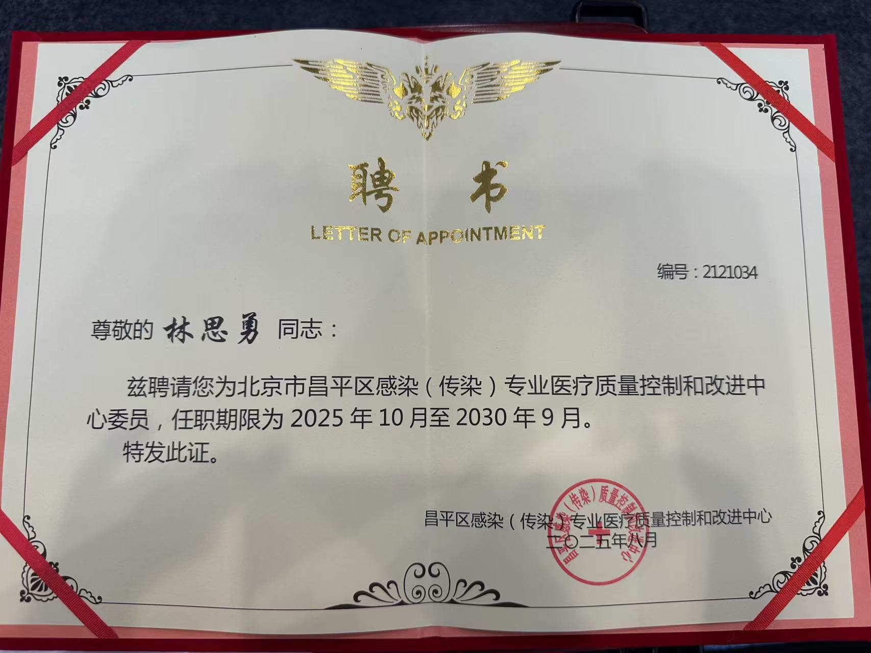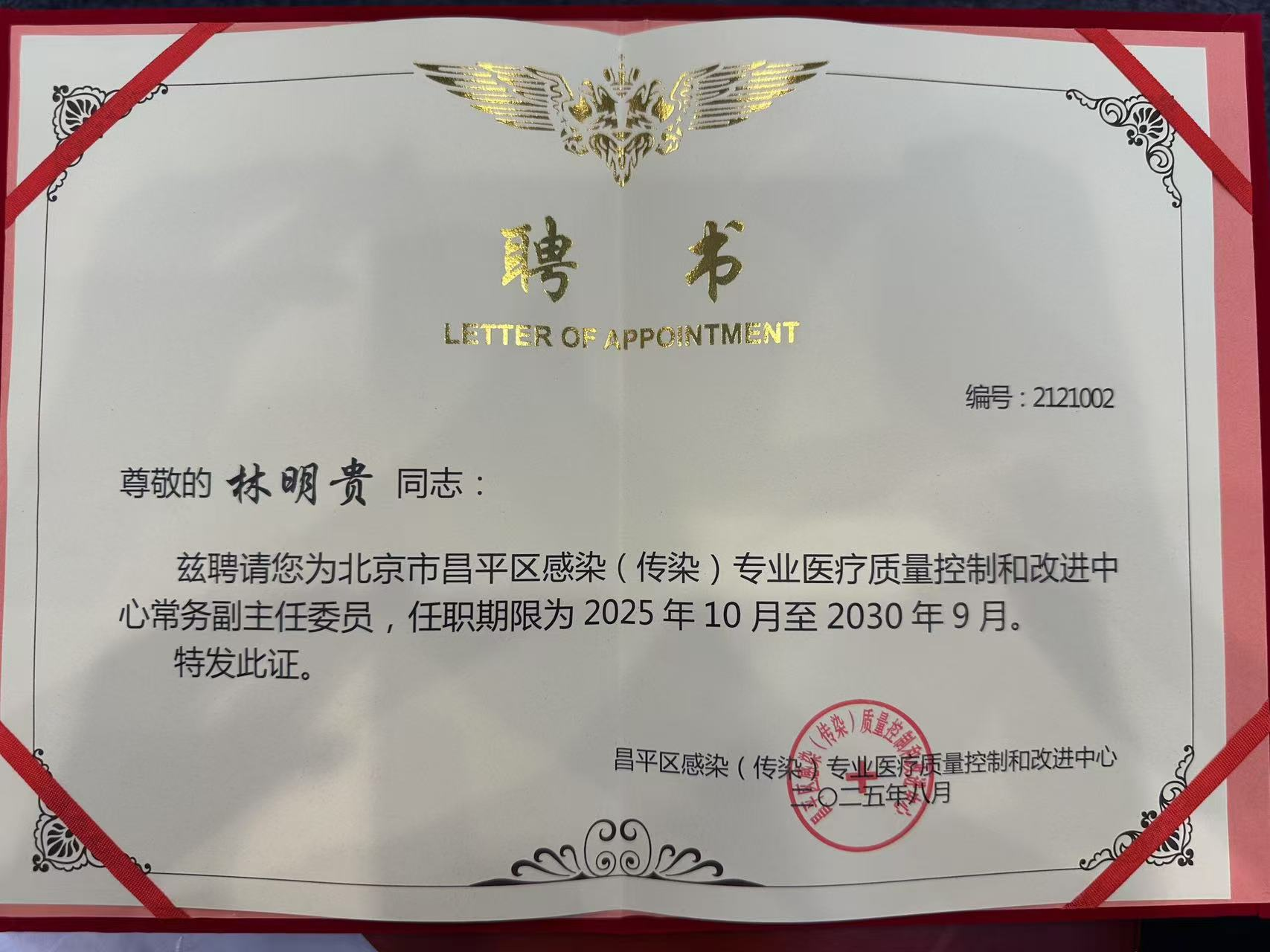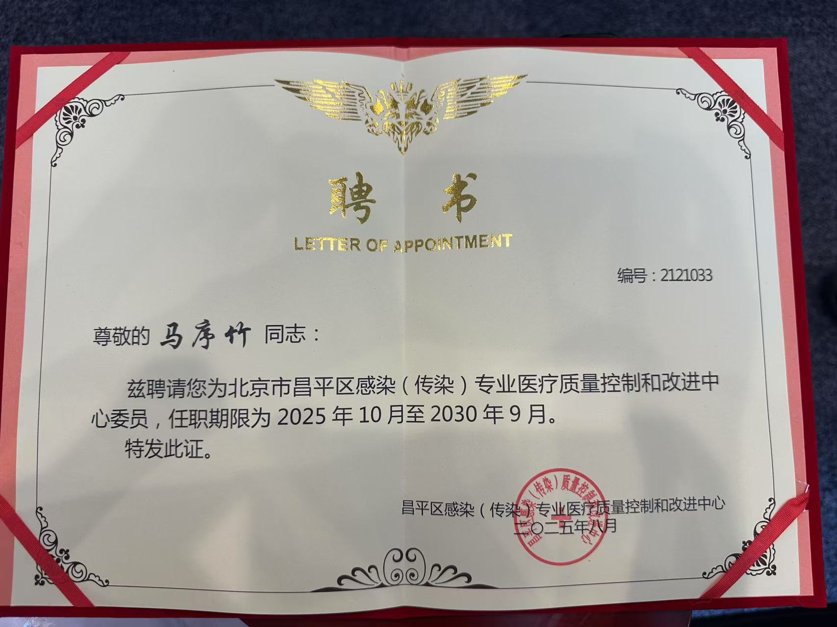 国内各位专家学者就当前感染(传染)性疾病热点问题做了汇报和交流,清华长庚感染性疾病科林明贵主任就《免疫功能-防治结核的利器》做了分享。同时会议对昌平区感染质控中心委员颁发了聘书及合影,我院林明贵主任担任常务副主任委员,马序竹主任、林思勇主任、李冬蓉护士、王梅青感染控制专员担任委员,王丽丽医师担任秘书。