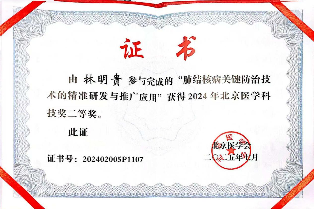 “北京医学科技奖”是由北京医学会设立的首都医药卫生行业的科技奖项,旨在引领首都医学科技创新发展,推动尖端医学科研成果的产出。该奖项自2015年设立以来,每年评选一次,主要表彰在医学科学研究、技术创新、成果转化、卫生管理和医学科普等方面取得突出成就的项目和个人。2025年7月北京医学会发布《北京医学会关于2024年度北京医学科技奖奖励的决定》,本届共评选出24个获奖项目。其中,我院感染性疾病科林明贵主任参与的首都医科大学附属北京胸科医院牵头的“肺结核病关键防治技术的精准研发与推广应用”喜获本届北京医学科技奖二等奖。