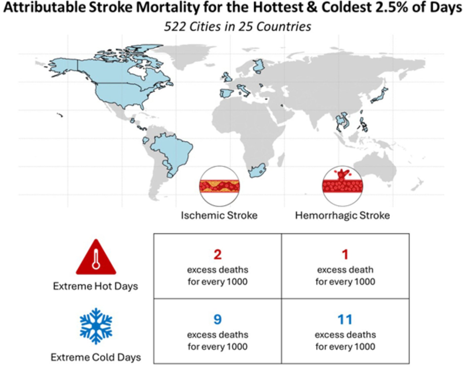 [1] Alahmad B, Khraishah H, Kamineni M, et al. Extreme Temperatures and Stroke Mortality: Evidence From a Multi-Country Analysis. Stroke. 2024. 55(7): 1847-1856.