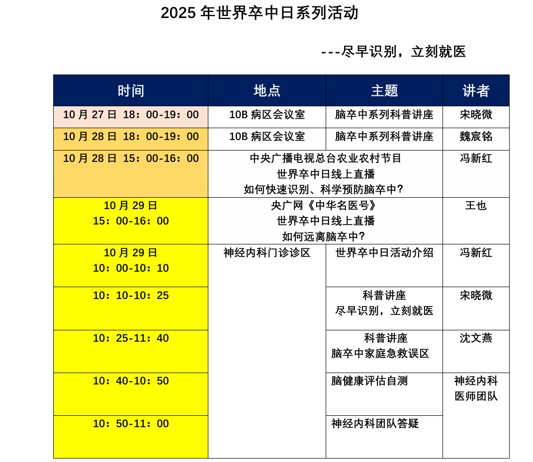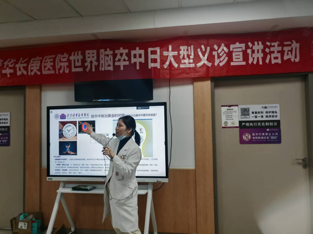 北京清华长庚医院10月29日电(神经内科 宋晓微)2025年10月29日是世界卒中日,今年的活动主题“尽早识别,立刻就医”。神经内科医护团队在北京脑血管病防治协会和北京女医师协会神经内科医生分会的组织下在不同场景举办了系列科普宣传活动。包括线上媒体宣传,线下科普,患者教育,现场答疑,宣传资料发放等。内容包括脑卒中症状的识别,脑卒中风险评估,脑健康自测,脑卒中急救误区,常见危险因素识别管理,脑卒中饮食营养,体育运动等生活方式管理。通过本次宣传活动增加了大家对卒中防治知识的了解,引起对疾病的重视,普及健康知识,推动心脑血管病防治,助力百万减残工程贡献微薄之力。