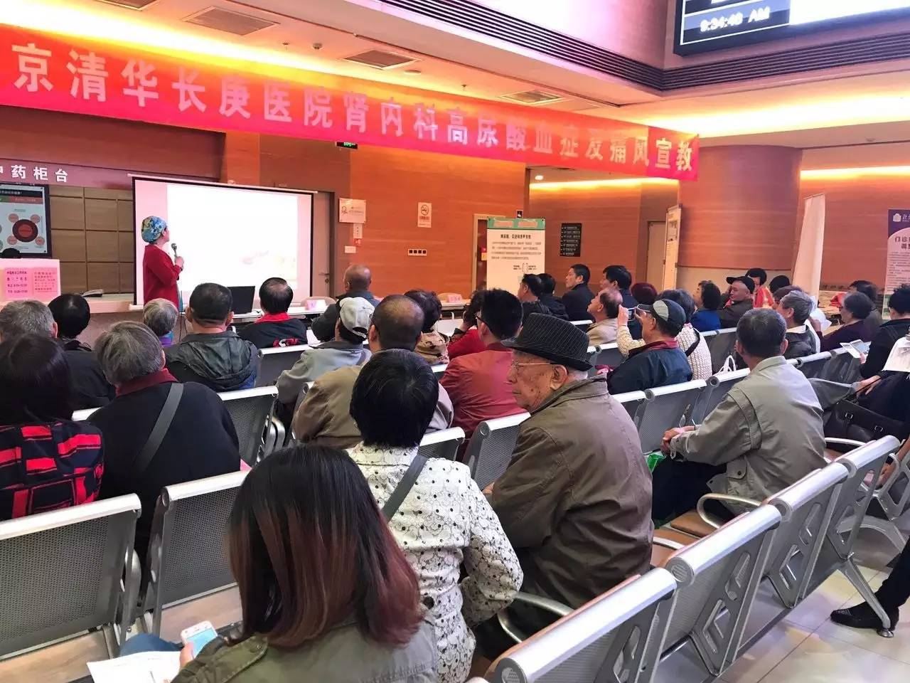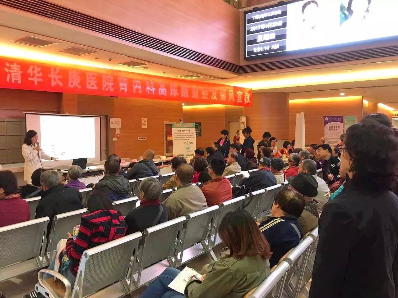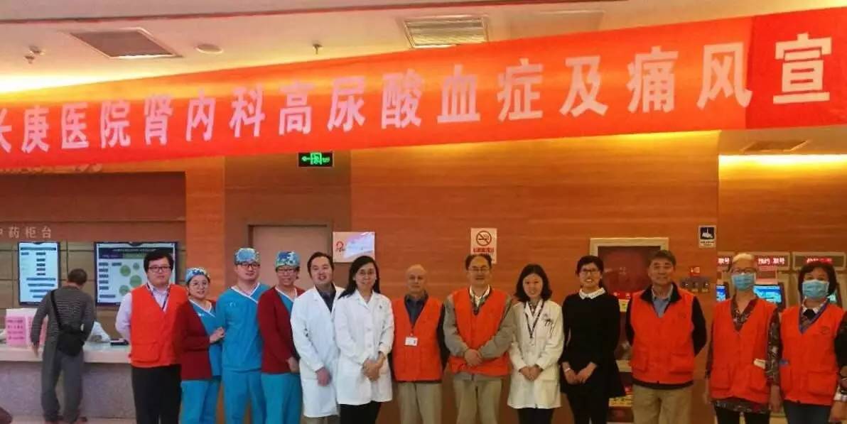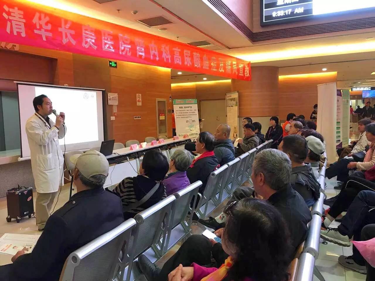 2017.4.20日上午,北京清华长庚医院肾内科举办了高尿酸血症宣教及义诊活动,不到8点门诊大厅就已经有患者在等候,9点活动准时开始,庄震副主任医师首先介绍420的数值,希望大家牢记这是高尿酸血症的诊断标准,因为高尿酸血症有很多危害。