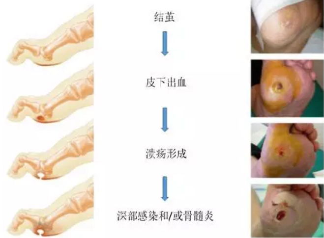 足部感染最常见的是糖尿病足,糖尿病足是如何发生的呢?除了血管病变外,感觉运动和自主神经病变,关节活动受限和局部压力增加是糖尿病足发生的主要原因。患者常有麻木、针刺样疼痛、烧灼感和感觉过敏,夜间加重,约25%年龄超过60岁的糖尿病患者容易出现糖尿病足。
