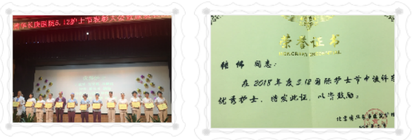 北京清华长庚医院(张伟)5.12护士节是属于白衣天使的节日,我为是一名护士而感到无比的骄傲和自豪。今年被评为优秀护士,既是对我工作的肯定,也是对我今后工作的鼓励。作为内科12A病房护士的一员,我感谢医院给我的平台,感谢肾内科李月红主任、内分泌科肖建中主任和张东敬护士长对我的信任和指导,感谢同样优秀的同事们对我的支持和帮助!我将再接再厉,不断进步!