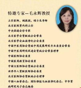毛永辉教授为北京医院肾内科主任,北京医学会肾脏病分会常委、北京医学会血液净化分会委员、中国中医药协会肾病中药发展研究专业委员会常委、中国中医药研究促进会肾病分会常务理事等,为中国心血管杂志、国际移植与血液净化杂志、中华肾病研究电子杂志编委,在老年慢性肾脏病、慢性肾脏病合并心血管疾病诊疗等方面有丰富的经验。