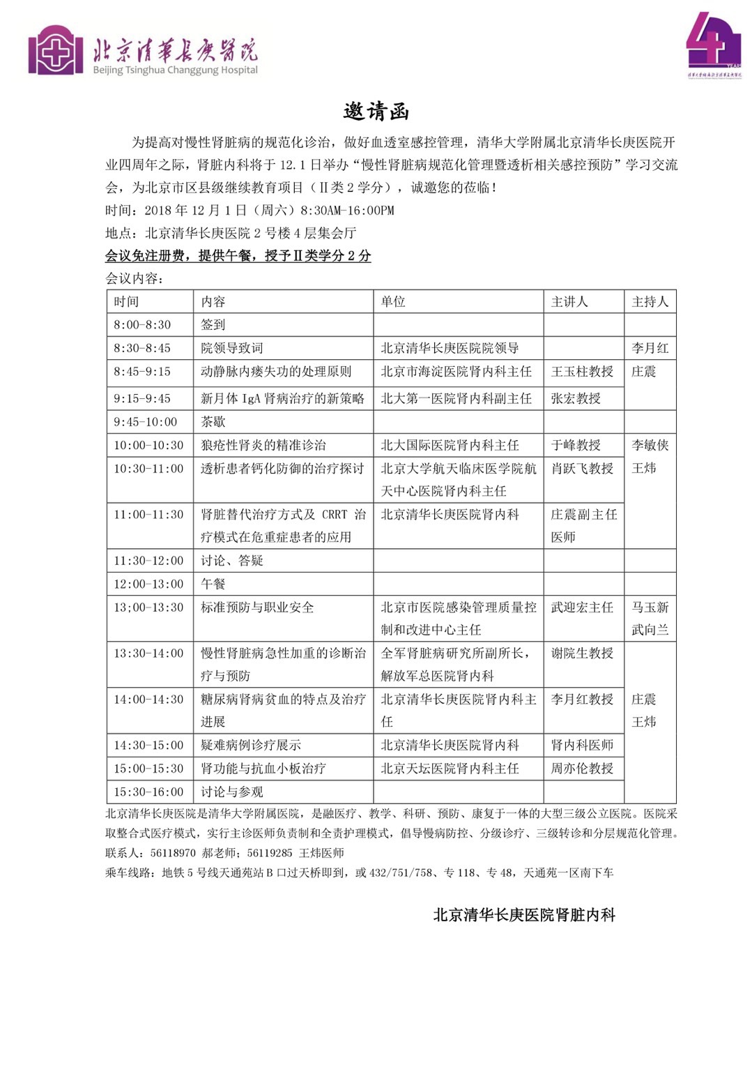 为提高对慢性肾脏病的规范化诊治,做好血透室感控管理,清华大学附属北京清华长庚医院开业四周年之际,肾脏内科将于12月1日举办“慢性肾脏病规范化管理暨透析相关感控预防”学习交流会,为北京市区县级继续教育项目(Ⅱ类2学分),诚邀您的莅临!