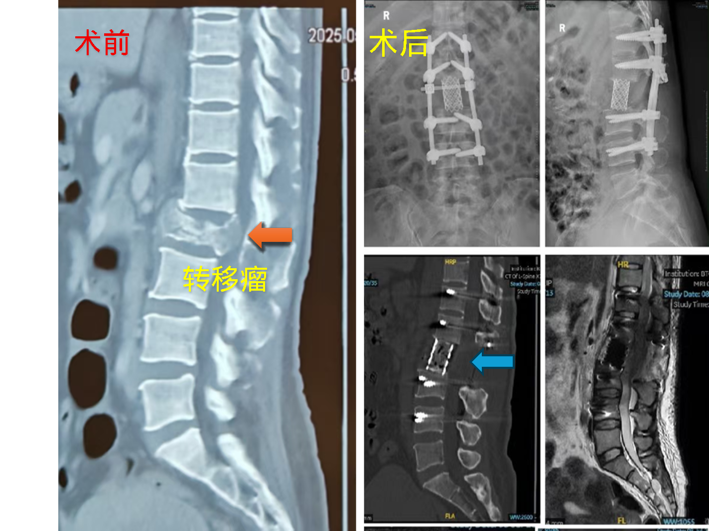 患者因膀胱癌腰椎脊柱转移,双下肢急性瘫痪大小便失禁,急诊椎体肿瘤切除+椎体重建内固定术。