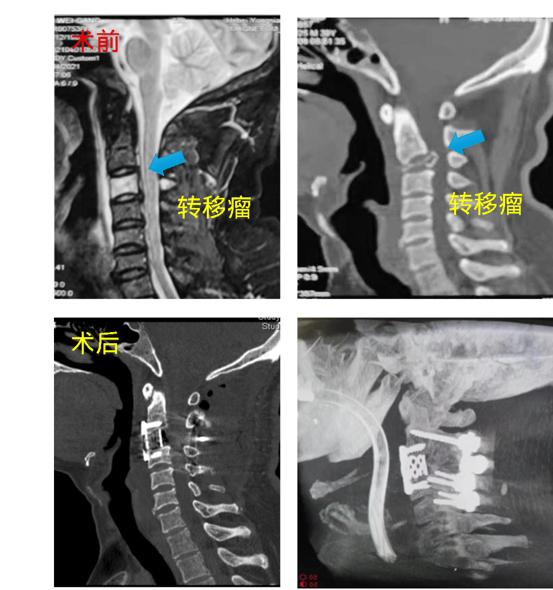 患者因乳腺癌转移到颈3椎体,颈部剧烈疼痛且难以抬头,肿瘤切除+重建固定术,术后疼痛消失,颈部支撑力恢复。