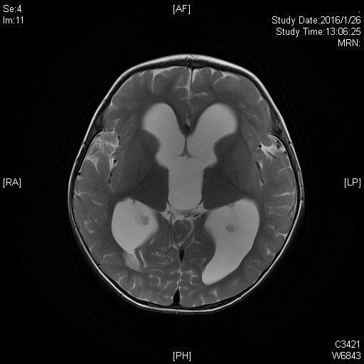 患者小萌(化名)是一名来自河南的17个月大小男孩。小萌的父母在来我院5天前发现他眼姿不正,在当地医院检查,发现了四脑室占位、脑积水。因病情的的复杂性,当地医院不能处理,建议来我院神经外科王贵怀主任门诊就诊。