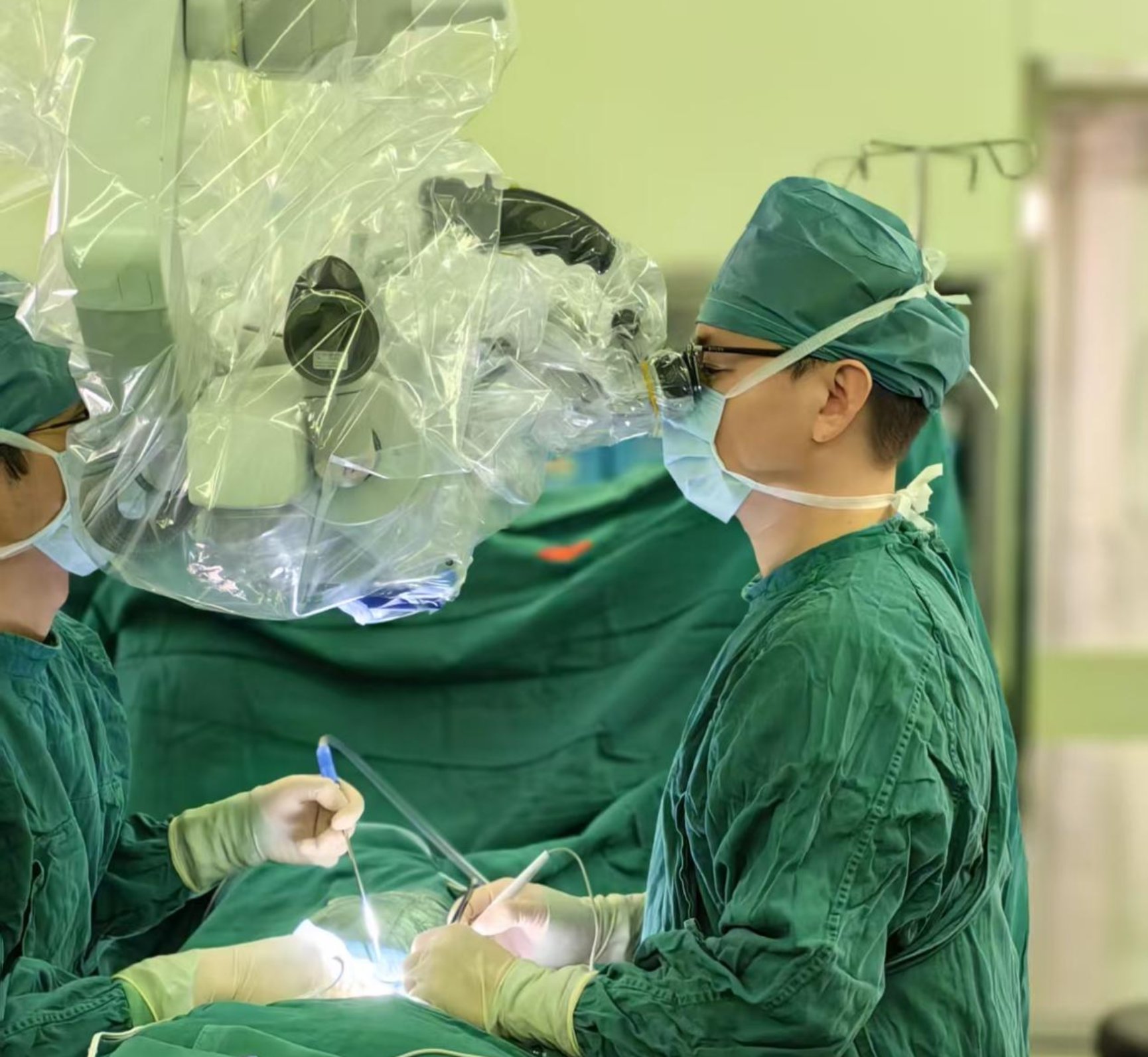 经过详细沟通病情,张培海医生为甜甜制订了显微神经松解的治疗方案,以期解除导致头痛的神经压迫。手术当日,主刀张培海根据受压神经走行方向,设计了发迹内的微创切口,显微镜下松解卡压枕神经的增生肌肉腱膜,暴露神经后,沿其正常走行进行游离。游离过程中发现,患者枕大神经远端被增生的炎性组织挤压变扁,临近增生组织与其缠绕伴行,局部粘连紧密,在保证神经不受损伤的前提下,张培海继续充分游离和松解枕神经,解除其压迫。术后,甜甜的头痛症状完全消失。