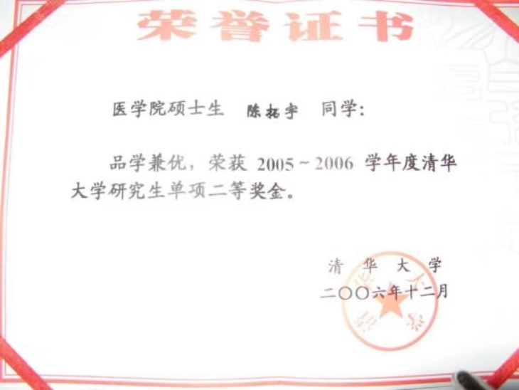 2012年,北京天坛医院小儿神经外科主任张玉琪教授加盟清华大学,为充实加强玉泉医院骨干力量,陈拓宇也被调回清华大学第二附属(玉泉)医院。之后的十年,他一直追随张教授左右,在神经外科四病区从事小儿神外及脑肿瘤的临床一线工作。曾协助张玉琪教授完成国家科技部十三五重点研发1项,国家自然科学基金1项,清华大学自主科研1项,还争取到了清华大学春元基金、白求恩基金、泰迪基金等专项基金的支持。至2022年,陈拓宇已成长为神经外科四病区副主任、小儿神外及脑肿瘤专业组组长。2023年4月更是与张玉琪教授一道,凭借着仿生骨儿童颅骨修补的特色,获得了日内瓦国际发明奖金奖。