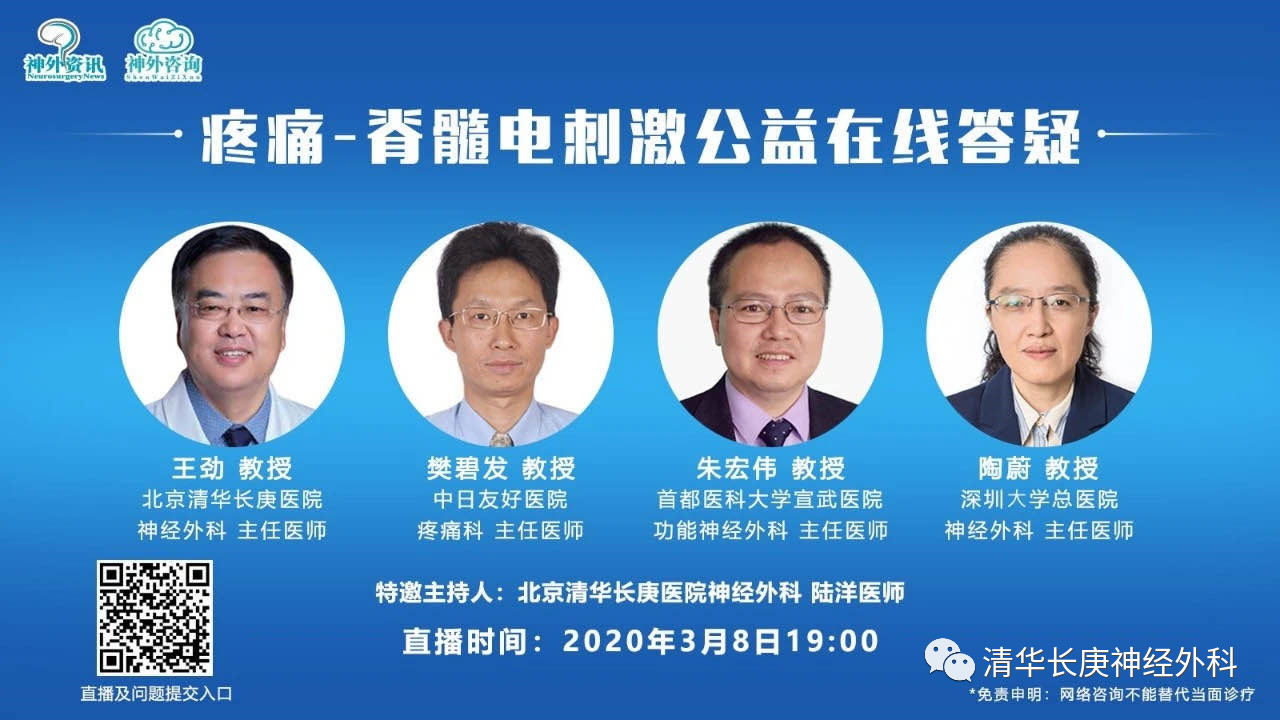 我院王劲副院长联合中日友好医院樊碧发教授、北京宣武医院朱宏伟教授及深圳大学总医院陶蔚教授为广大“疼痛-脊髓电刺激”病友提供在线公益咨询,深入解答了“脊柱脊髓术后顽固性疼痛、脊髓损伤后疼痛、臂丛神经损伤后疼痛、带状疱疹后神经痛、残肢痛及幻肢痛”等专业问题。
