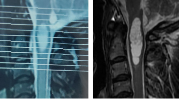 图3 张先生在我院复查的核磁,病变范围从延髓到颈3椎体上缘