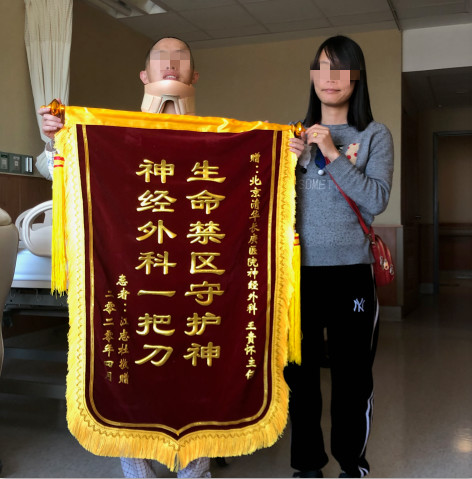 图5 患者术后第3天下地,为王贵怀主任献上锦旗