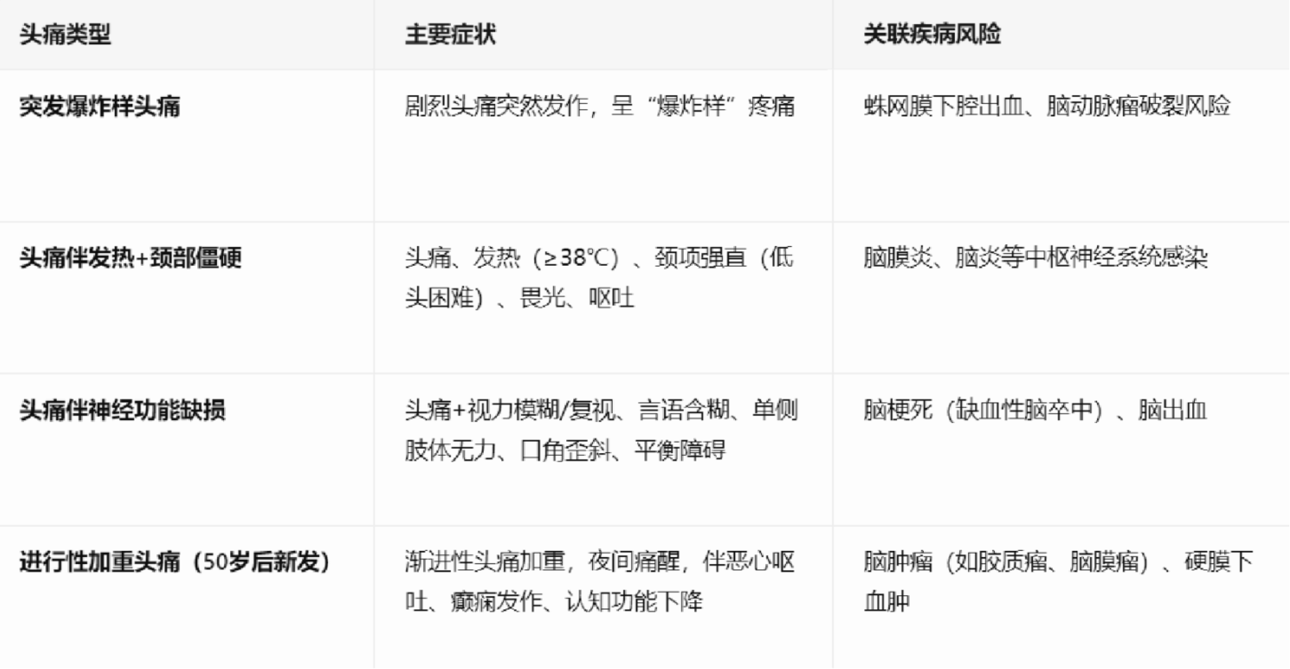 对于头疼的病人,如果出现以下危险症状须尽快就医,可能提示脑肿瘤、脑出血或脑膜炎等,需前往医院就诊,具体如下图所示。