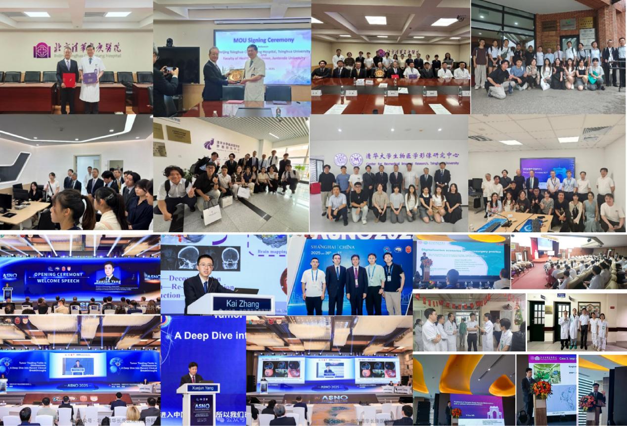 本年度,科室国际交流活跃,影响日益扩大:杨学军教授深度参与亚洲神经肿瘤学会(ASNO)事务,并于2025年5月当选ASNO副主席及候任主席,将于2028年接任主席职务,是中国学者在该组织的历史性突破。科室成员多次受邀在国际顶级学术会议发言,包括美国神经外科医师学会年会(CNS)、欧洲神经肿瘤年会(EANO)、世界神经外科大会(WFNS)等,展示我在混合现实导航、脑血管病外科、神经肿瘤等领域的创新成果。持续深化与日本顺天堂大学、越南越德大学医院、美国斯坦福大学、哈佛医学院等机构的互访与合作,签订合作备忘录(MOU),推动师生交流、科研协作与联合培养。成功举办第二届“紫荆之巅”数智神经外科与神经肿瘤论坛,吸引多国专家共话前沿。承接新加坡国立大学—清华医学国际选修课,举办两期清华大学国际暑期学校项目,为来自日本、越南、埃塞俄比亚的学员提供培训,国际化教学平台日益成熟。