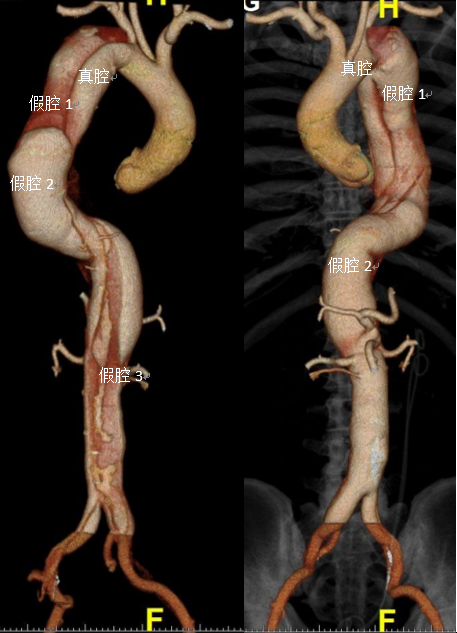 钟先生的主动脉夹层属于复杂Stanford B型夹层,但和其它大部分主动脉夹层比起来,治疗要困难的多,主要难度有两点。首先,如下图所示,直管的看,可以感觉到钟先生的主动脉被撕得七零八碎,如果仔细阅读影像资料,可以看出主动脉自上而下总共有3个假腔彼此相连,假腔巨大,真腔被压的很细,结构复杂,可能发生了多次撕裂,更为凶险。其次,钟先生的夹层幸运度过了急性期,但慢性期的夹层反而更加危险,假腔已经“定型”,采用常规的微创方法封堵近端破口,也会因为远端血管不能重新塑型,假腔持续血流冲击,而导致治疗失败。因此这类患者往往都要采取创伤较大的主动脉置换术,通过开胸和开腹手术将异常的主动脉置换成人工血管,手术截瘫和致死风险很高。而腔内治疗慢性主动脉夹层涉及破口封堵、内脏动脉重建、脊髓缺血等问题,国际上也仅有部分个案报道。在术前仔细的评估和与家属充分的沟通后,我们决定采取全腔内技术治疗这一例慢性主动脉夹层,封堵所有主动脉破口的同时重建所有主动脉重要分支血管。