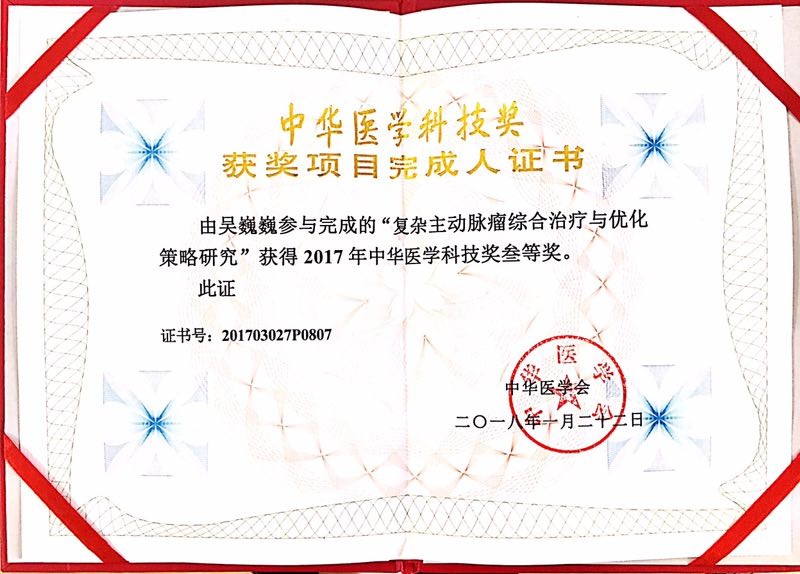 吴巍巍主任专注于复杂主动脉瘤腔内治疗,其《复杂主动脉瘤优化综合治疗策略体系的建立》项目于2017年获得华夏医学科技奖二等奖及2018年获得中华医学科技奖三等奖。