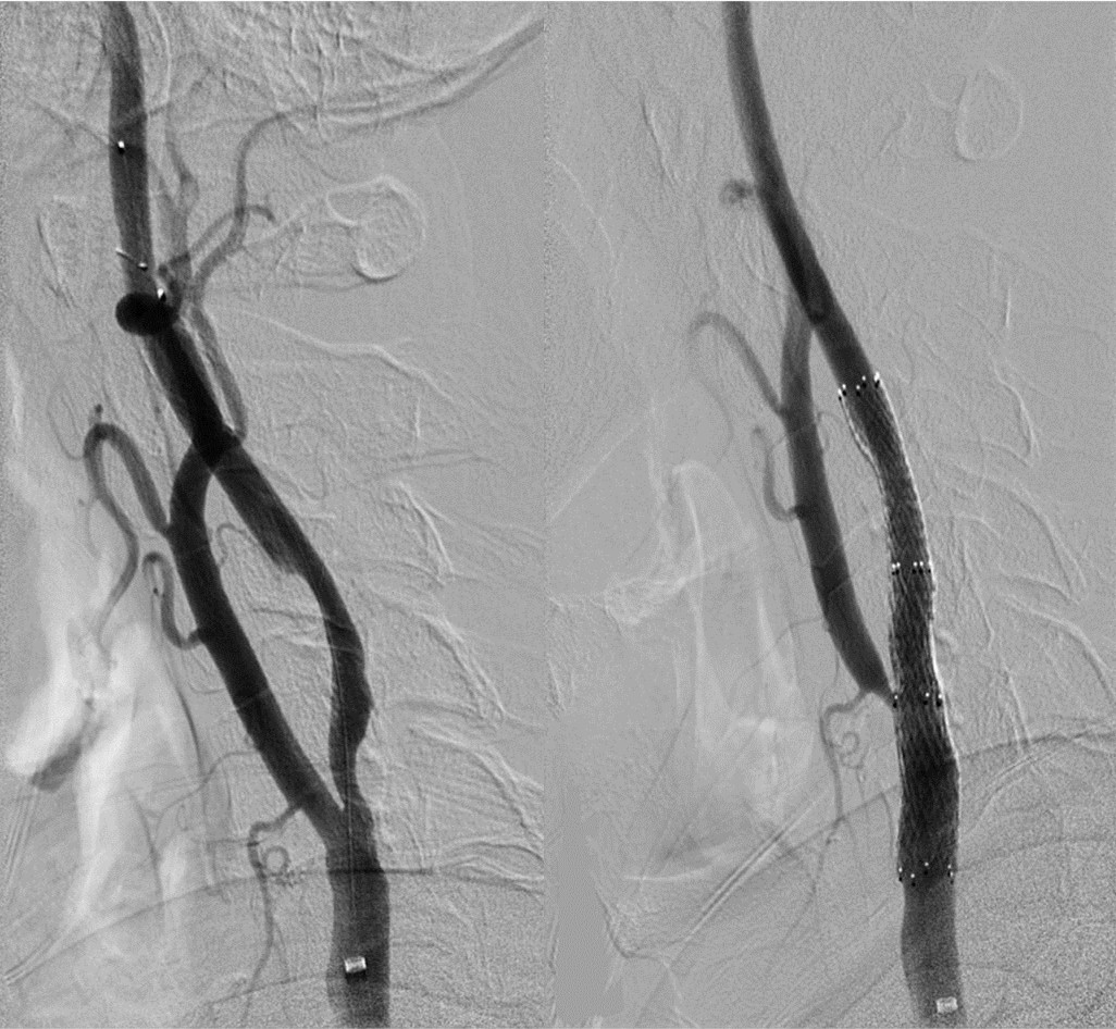 术前CTA提示王先生的主动脉弓形为“牛”型解剖变异(左侧颈总动脉从无名动脉发出,图1),颈总动脉起始部及颈内动脉均存在斑块狭窄,为手术增加了难度,经过仔细讨论分析病情,血管外科吴巍巍主任、赵克强教授决定“另辟蹊径”,从患者右上肢入路,实施微创颈动脉支架手术,同期解决颈总及颈内动脉两处病变。经过充分的术前准备,吴巍巍主任和赵克强教授在麻醉科医师的保驾下联手为王先生安全实施颈动脉微创支架植入术(图3、4),避免了王先生今后再次发生严重的脑卒中事件。术后返回病房,精准调控血压、心率,5天后王先生顺利康复出院。