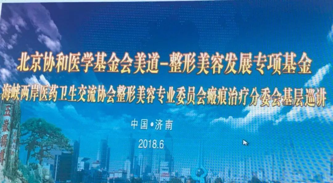 2018年06月23日,杨建民教授、李薇薇副教授参加北京协和医学基金会美道整形美容发展专项基金暨海峡两岸医药卫生交流协会整形美容瘢痕分委会基层巡讲(济南)。