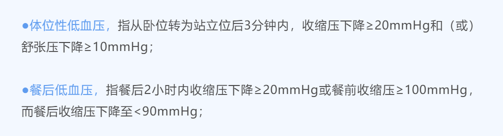 另外,体位性低血压和餐后低血压以发作性低血压的形式出现,直接原因恰如其名,分别与体位(身体姿势)变化或进餐有关。二者的诊断标准与通常意义上的低血压略有不同: