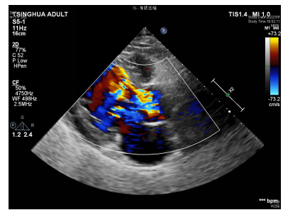 心脏超声:左室舒张末径63mm,左室收缩末径49mm,LVEF:54%。主动脉瓣三瓣叶,均毛糙,其上探及数个不规则条索样回声,长约13-26mm不等,随心动周期摆动,舒张期脱入左室流出道,致瓣膜闭合不全,主动脉瓣瓣大量返流;二尖瓣前叶瓣尖略增厚、回声增强,瓣叶开放尚可,关闭欠佳,二尖瓣少量返流;余瓣膜形态及结构未见异常。结论:1、主动脉瓣占位,赘生物可能性大,重度关闭不全;2、左心室增大,室间隔增厚;3、二尖瓣少量返流;4、左室整体收缩功能减低