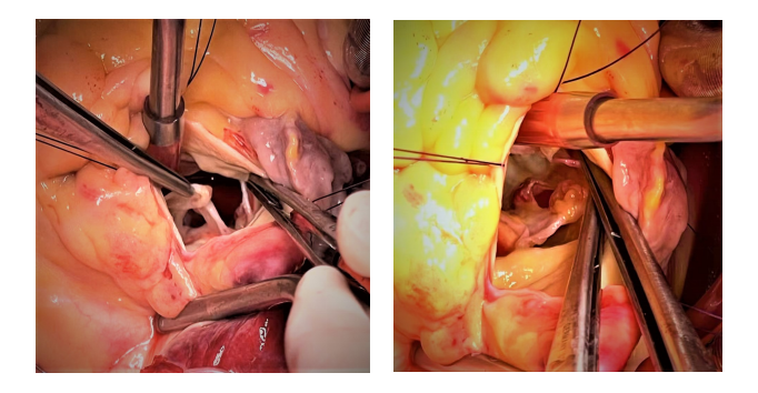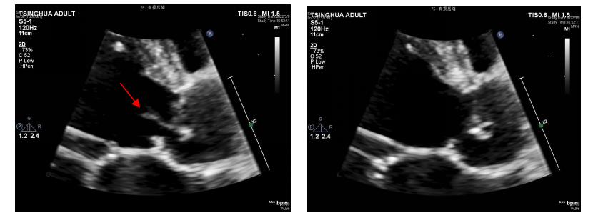 3)2周后,患者体力恢复良好,随即在全麻低温体外循环下行主动脉瓣机械瓣置换术。术中可见升主动脉及主动脉窦部正常,主动脉瓣左冠瓣及无冠瓣均有穿孔。同时,无冠瓣可见赘生物形成。(如图5-A,B)