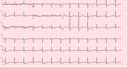 图3:入院当时心电图,窦性心律,V1-6ST段压低,Ⅱ、Ⅲ、αVF ST段轻度压低,T波低平倒置