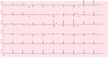 图4:入院后第三天心电图,窦性心动过缓 Ⅱ、Ⅲ、αVF ST段轻度压低,T波低平倒置。ST段较入院时改善