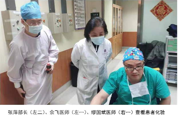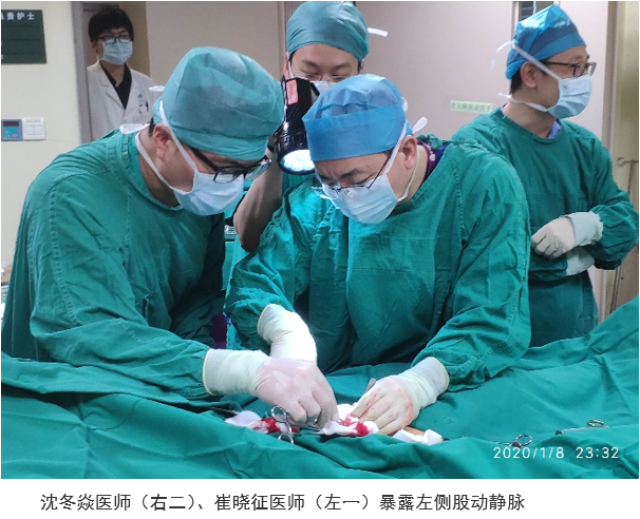 虽然已是深夜,但CCU病房灯火通明。为了避免患者病情进一步加重错过最佳治疗时期,沈冬焱医师、薛亚军医师、缪国斌医师及崔晓征医师组成ECMO小组,决定马上应用ECMO对患者进行辅助。沈冬焱医师及崔晓征医师迅速暴露患者左侧股动静脉,采用V-A插管方式,在CCU王文护士长的协助下,ECMO成功运转。经过精密调节各项参数,老孙的血压及氧合逐渐平稳,大家的心里的石头也渐渐落了地。夜已深,麻醉中的老孙并不知道,这一夜多少人为他而不眠。