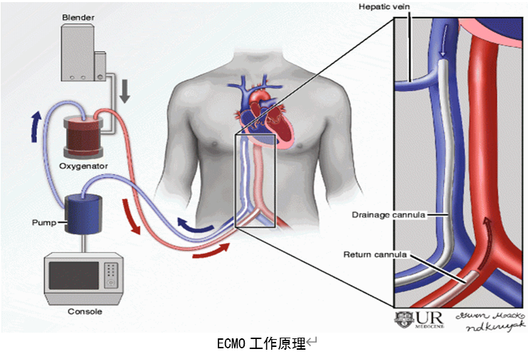 ECMO(extracorporeal membrane oxygenation),即体外膜肺氧合,该装置可以将人体静脉血引出体外,让血液结合氧气之后,再泵回体内。近年来被广泛应用于心功能衰竭和呼吸衰竭的治疗。由于ECMO运转时可以完全替代心脏及肺脏功能,所以被称为“起死回生”的“神兵”一点都不为过。