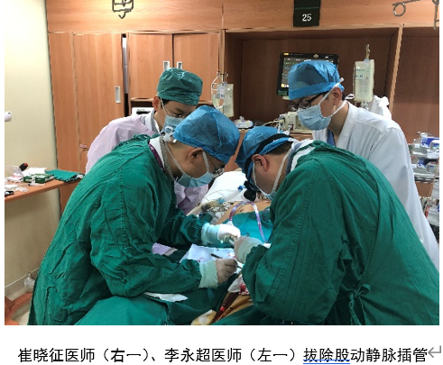 然而置入ECMO只是治疗的第一步,在根据患者病情调节机器的同时,还需要时刻警惕ECMO相关的并发症。可喜可贺的是,在心脏中心医师及护理团队的精心照料下,老孙顽强地挺过了出血、感染、溶血等一道道考验,心脏的功能也逐渐开始恢复,从刚开始的射血分数只有14%,提高到了40%。心脏内科佘飞副主任医师全面评估患者后,认为老孙的呼吸循环功能稳定,已符合脱机标准。2020年1月18日,在崔晓征医师及李永超医师的协助下,老孙体内的股动静脉插管被顺利撤除,整个操作过程老孙生命体征平稳。至此,我院心脏中心应用V-A ECMO抢救心源性休克宣告成功。