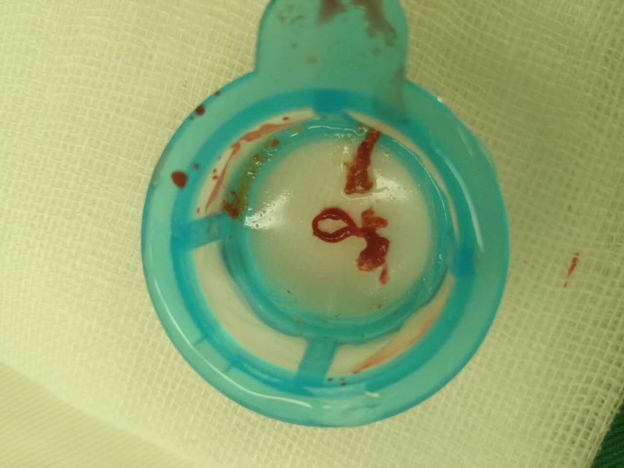 图一 抽吸导管紧急行血栓抽吸,抽出两大块新鲜血栓