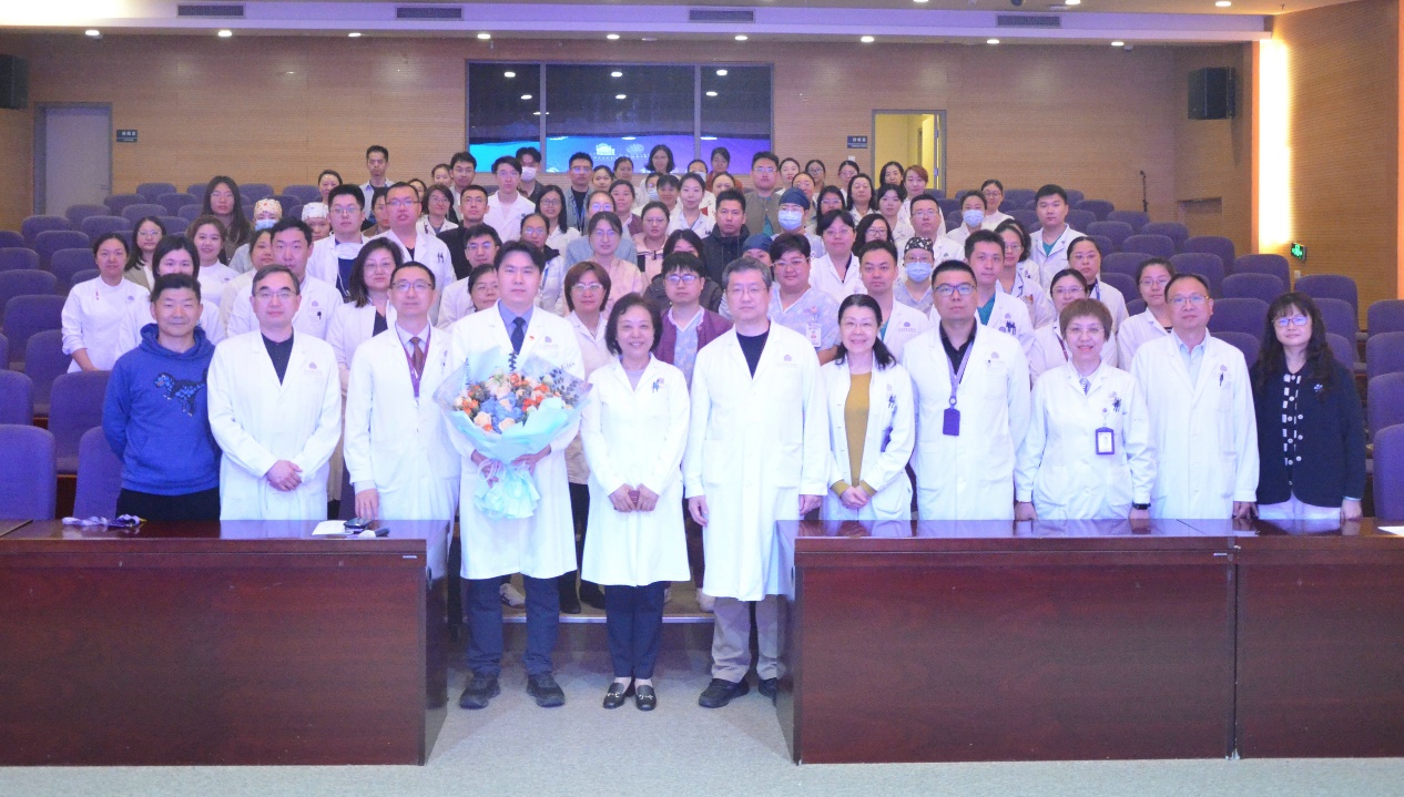 在热烈的掌声中,张萍教授带领心血管中心核心团队向贾一新主任献上鲜花。全体与会人员合影留念,定格这一历史性画面。