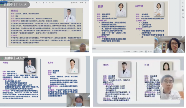 在佘飞主任医师的主持下,先后由薛亚军、马志毅、刘元伟副主任医师在线上进行心血管疾病诊断评估、危险因素防控、疾病康复等健康科普知识讲座及急救知识的宣教,佘飞、刘芳、缪国斌主任医师、周博达副主任医师,韩志伟、赵兰婷、向伟主治医师在线上进行健康咨询问答及义诊活动。义诊活动收到广大患者朋友的欢迎,累计上线人数上千人,提出的问题均得到各位专家的细致解答。