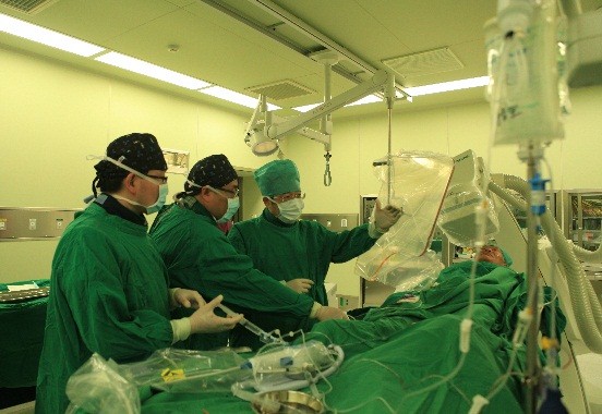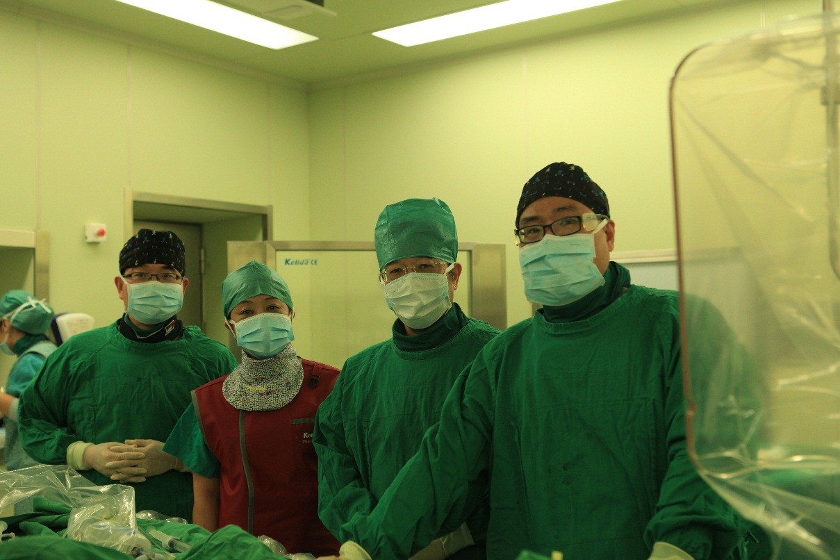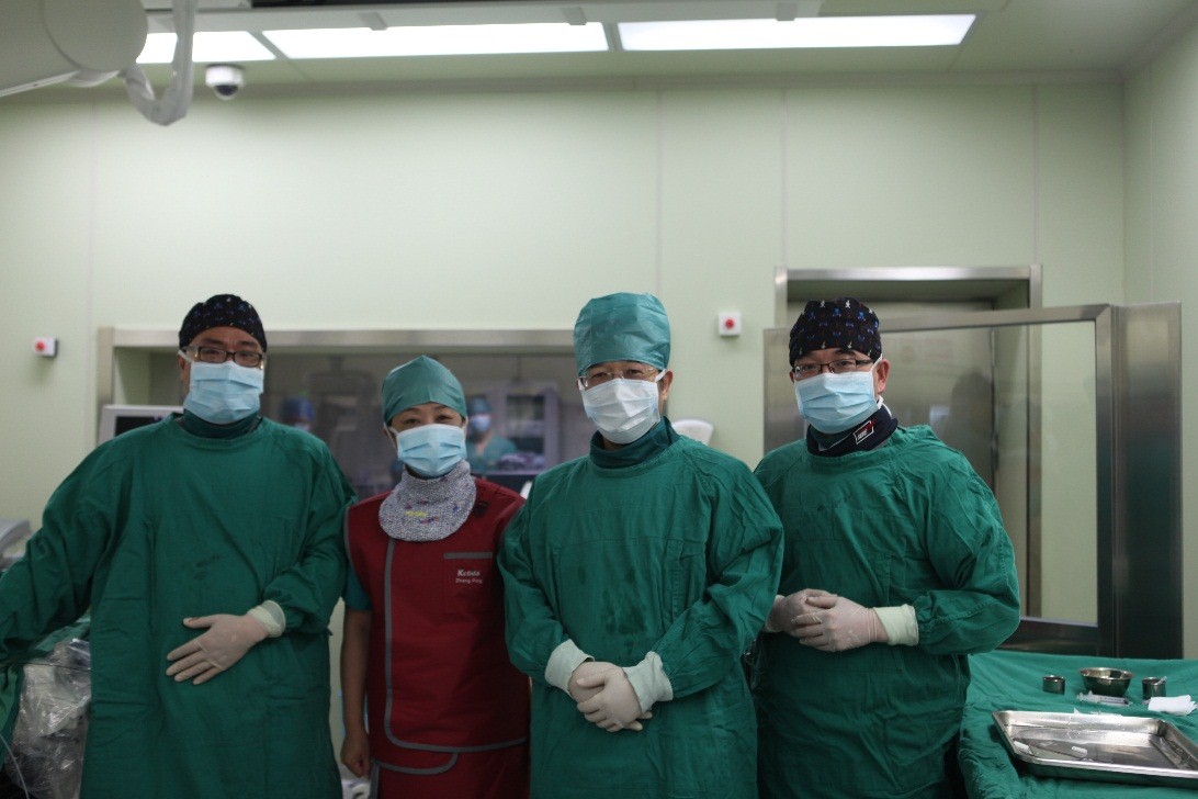 图1 王伟民主任(左3)、张萍主任(左2)、缪国斌(左4)及薛亚军(左1)医师在术中