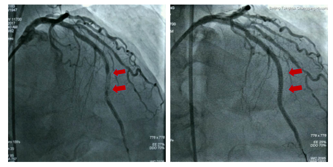 图3 激光消蚀术前及术后的冠脉造影结果对比